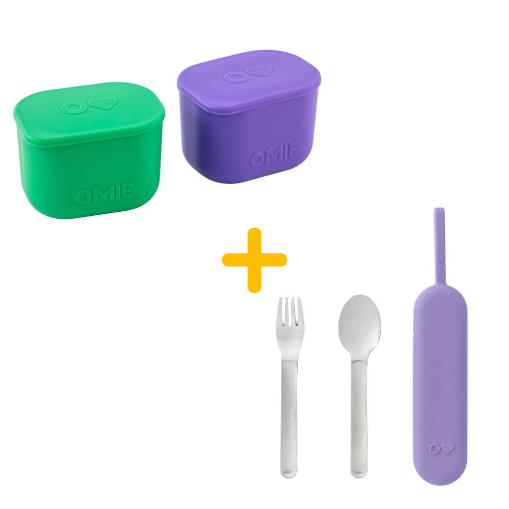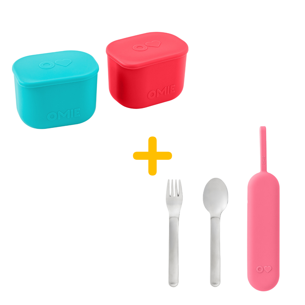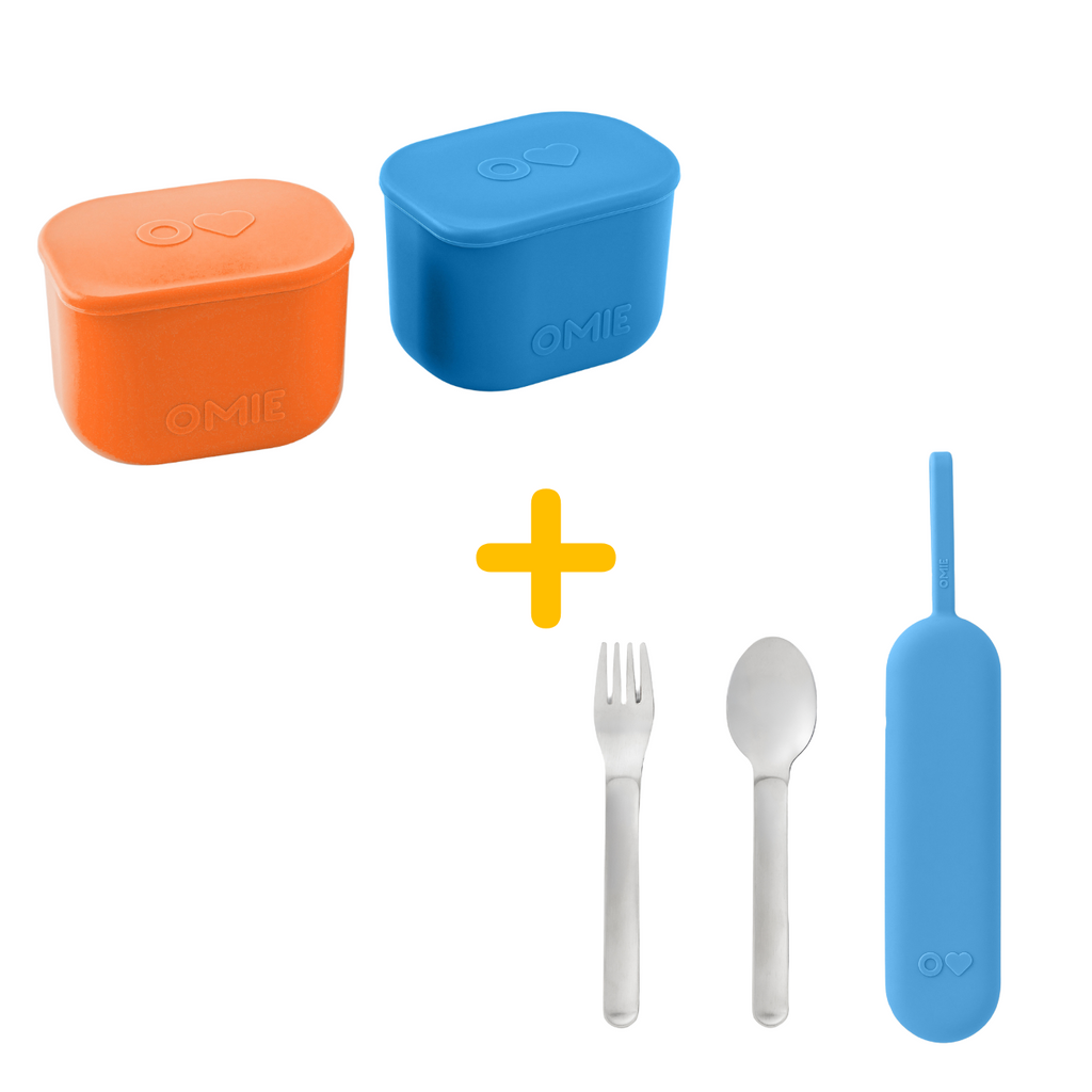 This set includes 2 dip containers and the matching fork and spoon with silicone carrier.